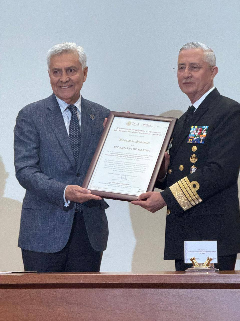 El Magistrado Presidente del Tribunal Federal de Conciliación y Arbitraje Cristóbal Arias Solís entregó un reconocimiento a la Secretaría de Marina por su invaluable apoyo para la realización del Conversatorio-Taller sobre el equilibrio de las relaciones laborales de los trabajadores al servicio de la Secretaría de Marina.